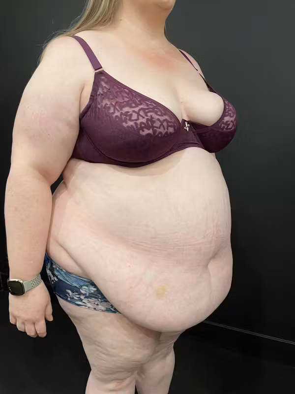 A 44-year-old patient, standing 5’8″ tall and weighing 316 pounds with a BMI of 48, underwent a Plus Size Tummy Tuck®, resulting in the removal of 18.4 pounds of tissue from the abdomen. Five months later, the patient returned for an umbilical hernia repair to address additional medical concerns. The before-and-after photos, taken five months apart, demonstrate the comprehensive improvement in abdominal contour and overall body appearance achieved through these procedures.